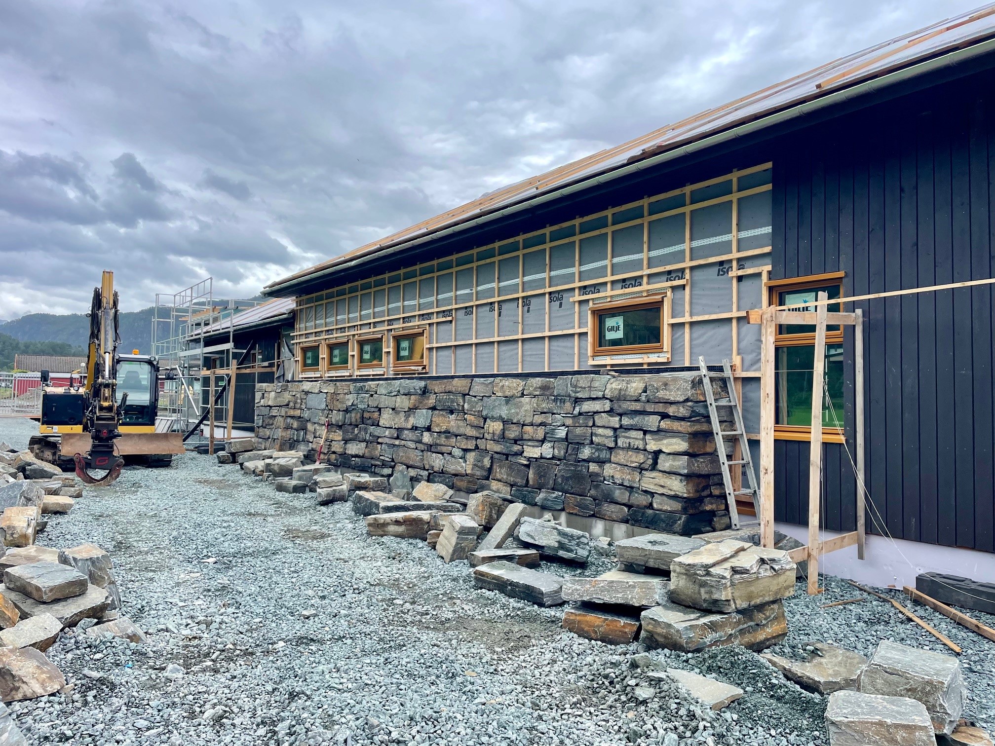 Me har i år mura natursteinsmurane, støypt golv og er klare for siste innspurt med ferdigstilling av uteområda.